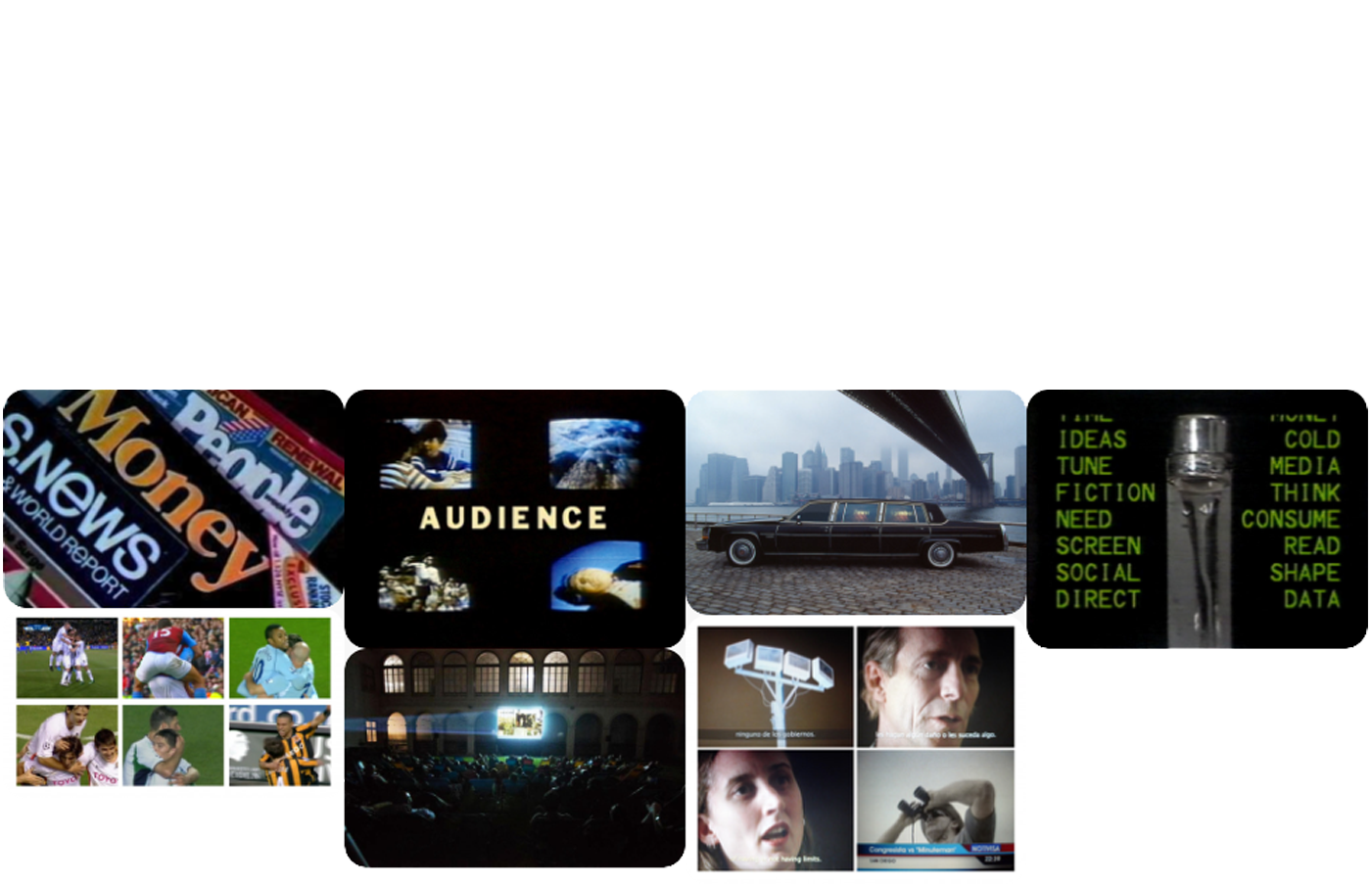 Périot meets Acconci applies the conceptual proposal of Vito Acconci — “while walking a continuous line down a city street. Try not to blink. Each time I blink: snap a photo.” — to the experience of watching the short movie 21.04.02 by Jean-Gabriel Périot «based on super-fast editing of images from TV, film, advertising, pornography…». Two people watch the film at the same time and try not to blink; each time they blink, the image is revealed.