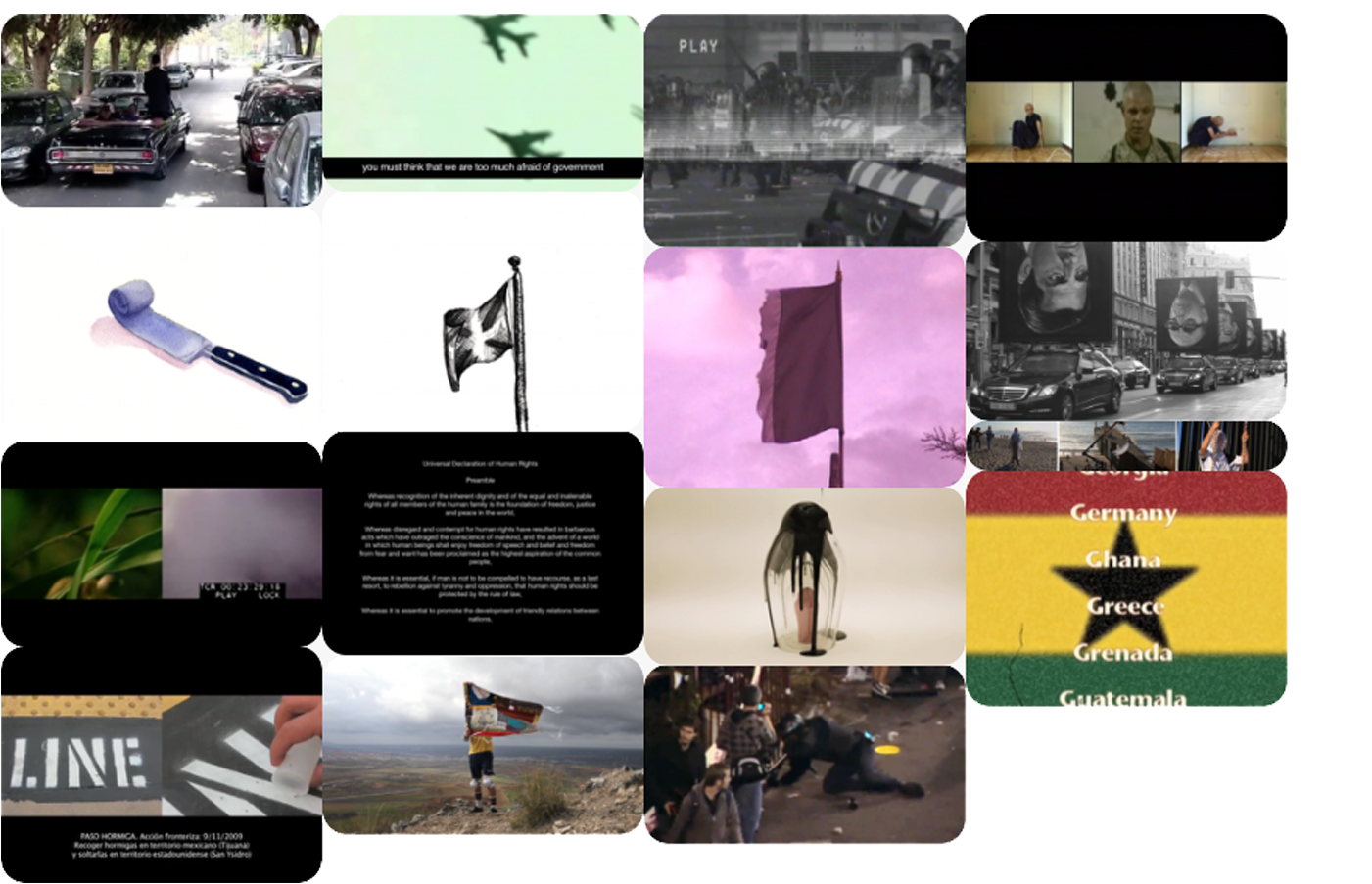 This selection of works is based on two “families”: the first, titled Interventions, includes works which reconnect with some engagement, a recent art evolution in Portugal, or works which interpret the real. The second, titled Appropriations, includes videos with a narration while capturing stories or works.